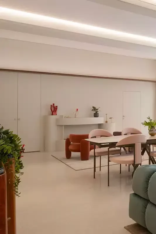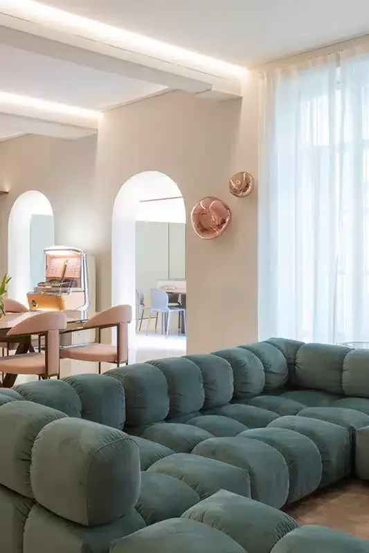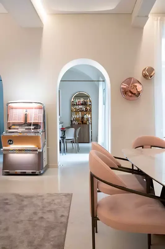 L’ambiente molto ampio e dai toni chiari è impreziosito da lampade preziose dalle forme scultoree per esaltare l’arredo e creare una connessione tra gli spazi.