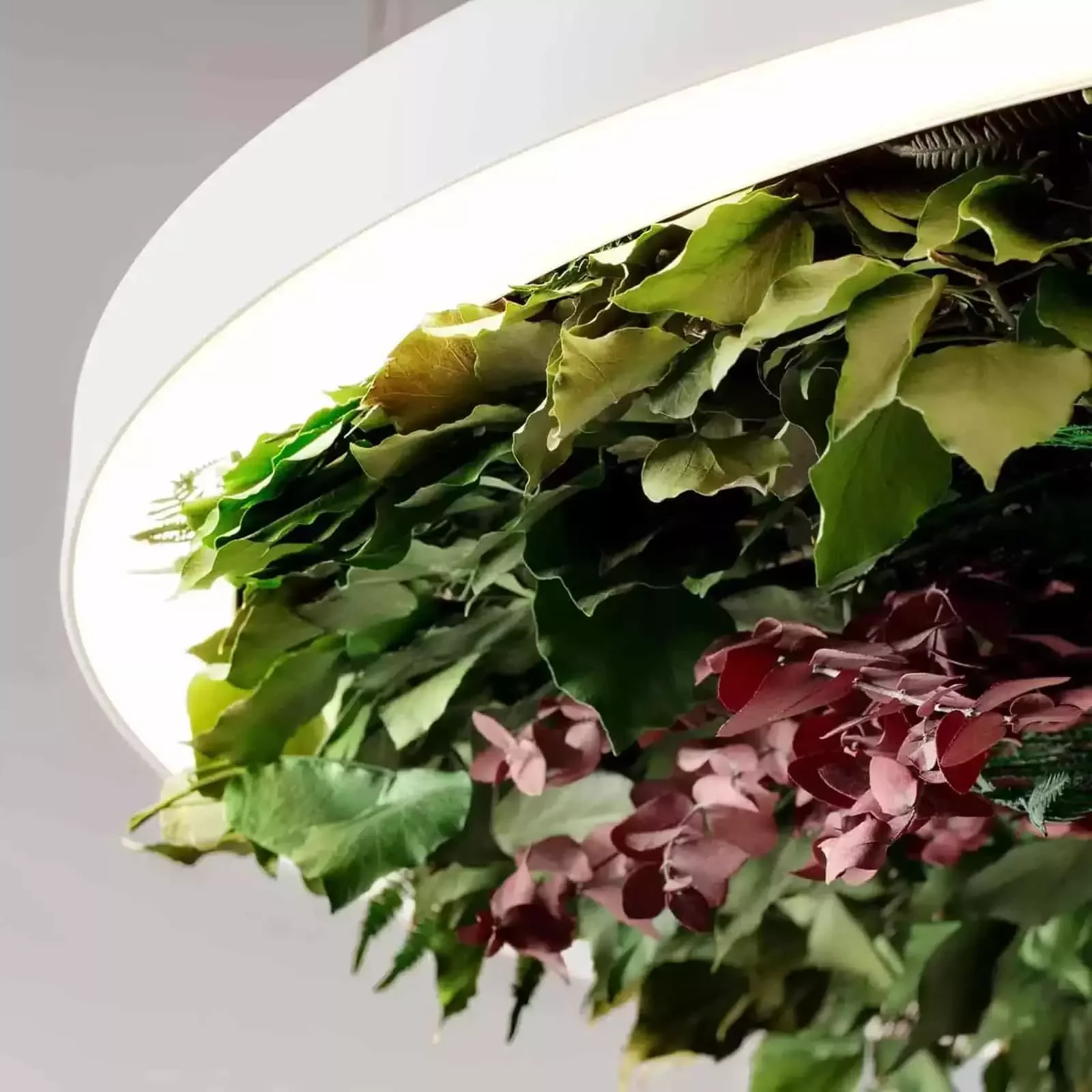 Le cornici geometriche di queste sospensioni ospitano le sorgenti LED e un piccolo giardino a testa in giù di foglie sempreverdi che regalano un originale effetto decorativo.