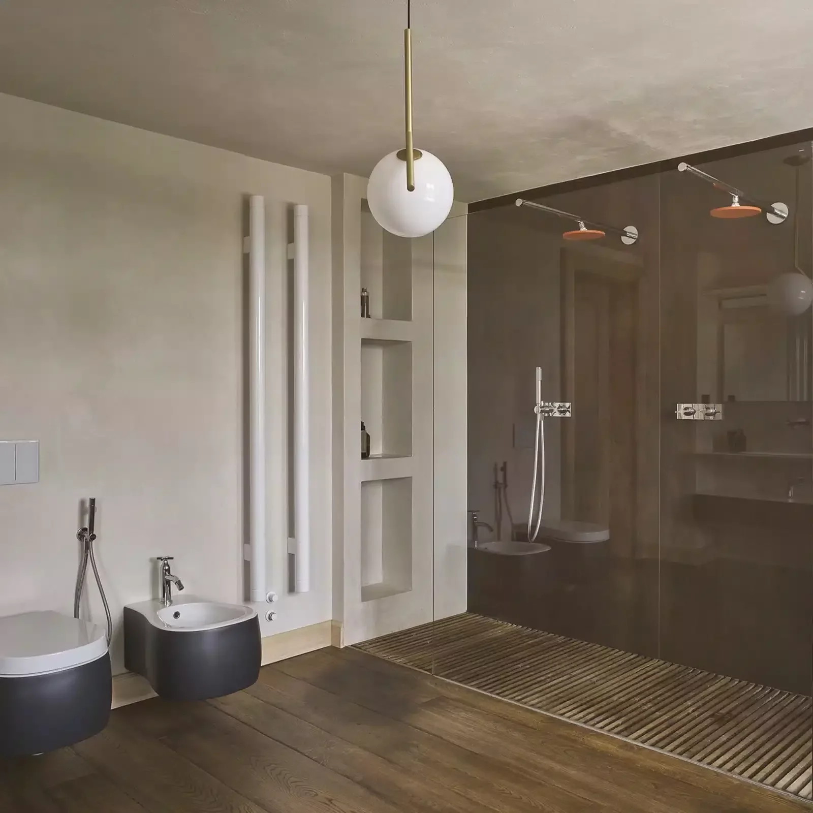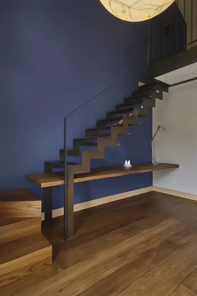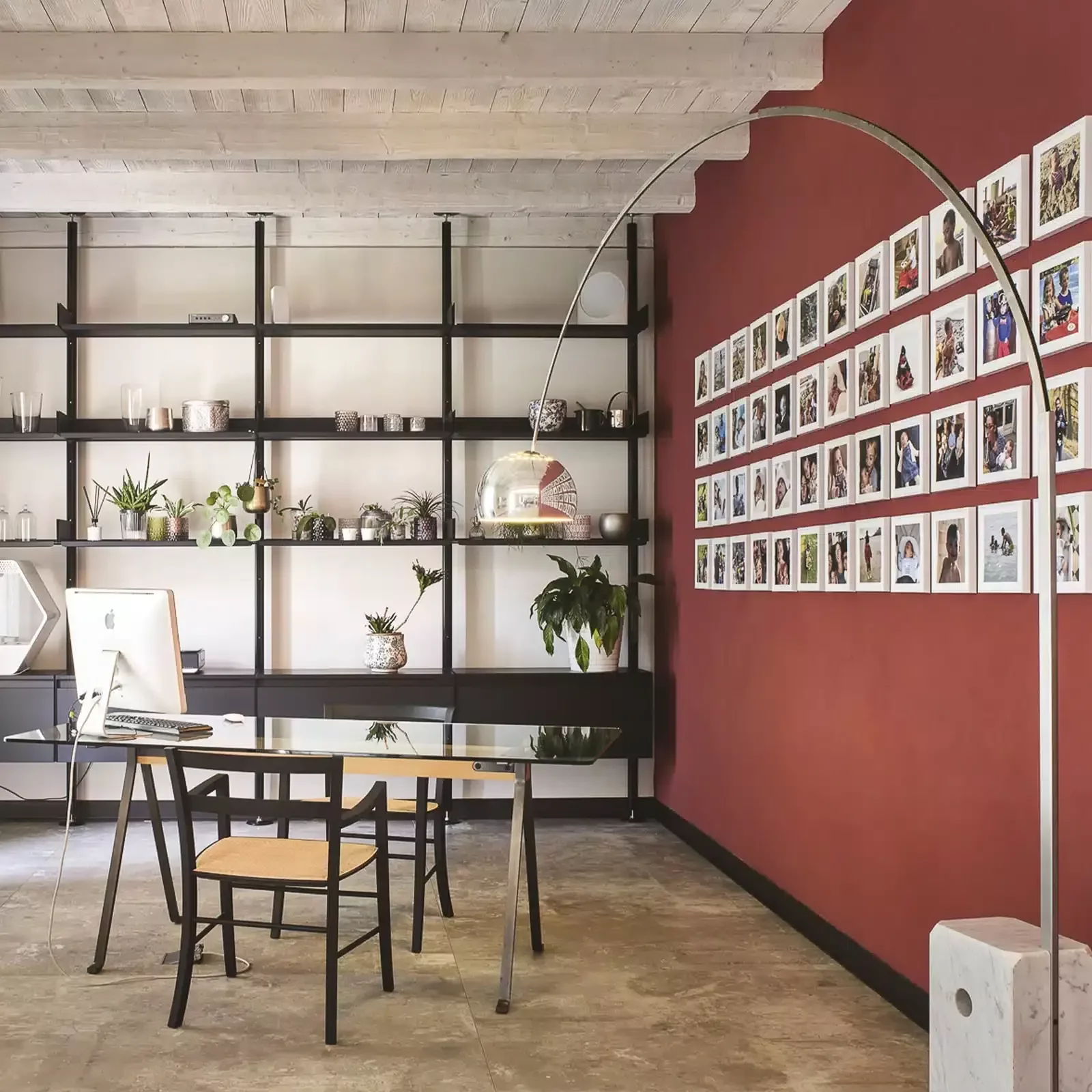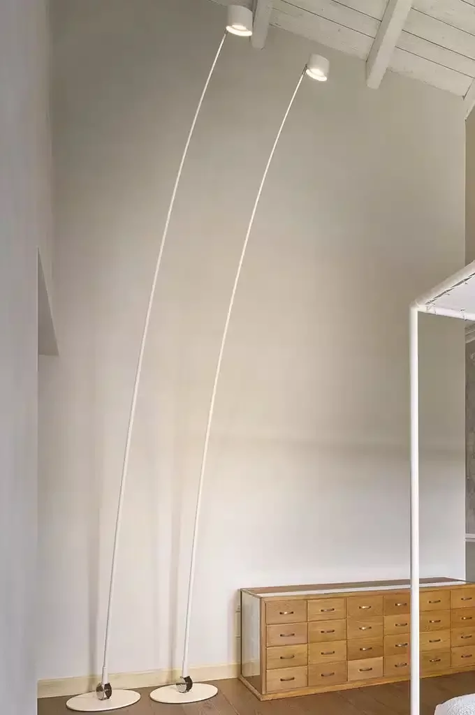 Nell’ambiente del soggiorno unito alla zona studio, la versione dimmerabile dell’Infinito di Davide Groppi fornisce una luce diffusa e discreta che, unita alle Masai e alle Sol 2 sempre di Groppi, conferisce un’intima profondità all’ambiente. L’atmosfera viene controbilanciata dalla luce raccolta dell’Arco di Flos, indispensabile per permettere flessibilità per spostamenti futuri senza tuttavia perdere la possibilità di luce diretta sul luogo di lavoro.