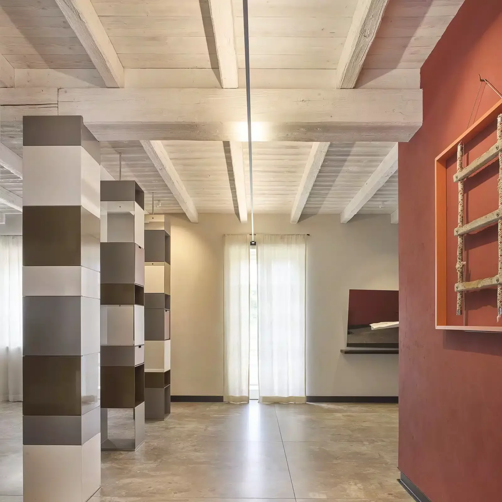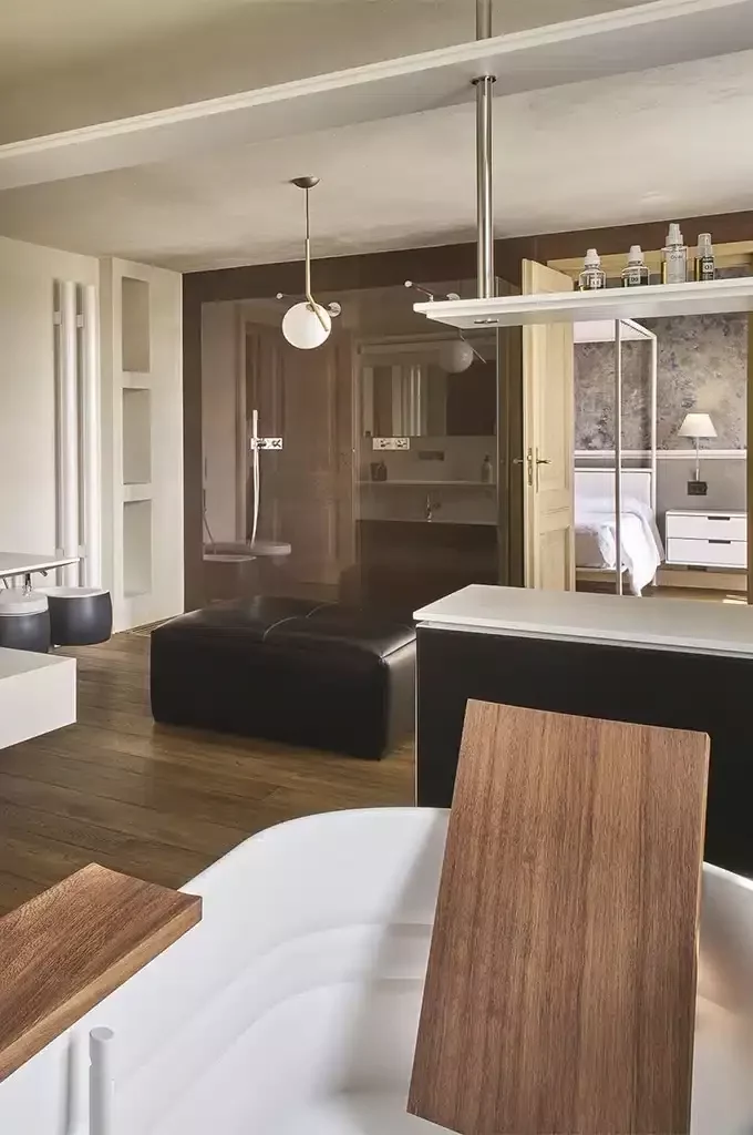 Anche nella camera padronale, l’illuminazione diffusa e piacevole ha incontrato la sfida di doversi interfacciare con una camera con soffitti alti quasi 7 metri.