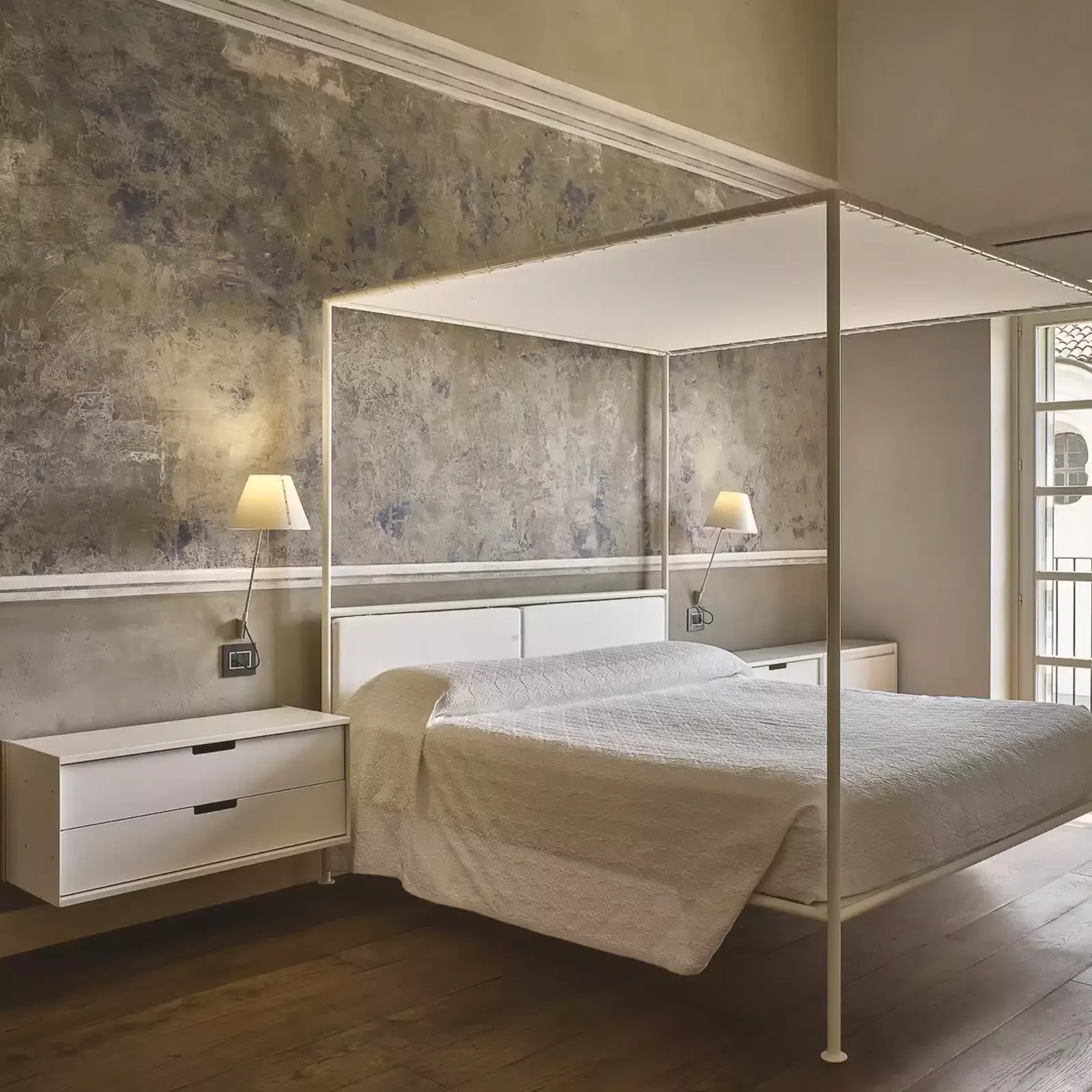 Le due SAMPEI 440 di Groppi hanno permesso di conferire una luce che sembra arrivare dal cielo. Le due luci a parete Costanza di Luceplan sono invece state poste in basso, all’altezza della testiera del letto.
