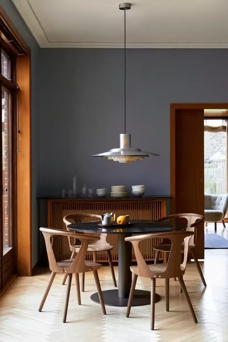 La sospensione P376 di &Tradition, ad esempio, è un’icona degli anni ‘60 e si inserisce perfettamente in questo ambiente con il tavolo e le sedie vintage In Between in legno dalle forme tonde.