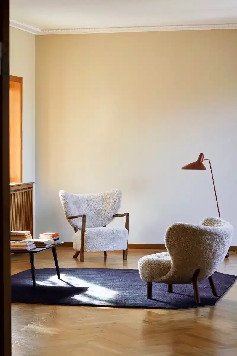 Un materiale come il legno, ad esempio, tende ad assorbire la luce quindi occorrerà scegliere una lampada sufficientemente potente con la giusta temperatura colore. La lampada da terra Tripod, ad esempio, illumina perfettamente questa zona giorno mettendo il risalto il parquet e la finitura delle poltroncine Wulff e Little Petra.